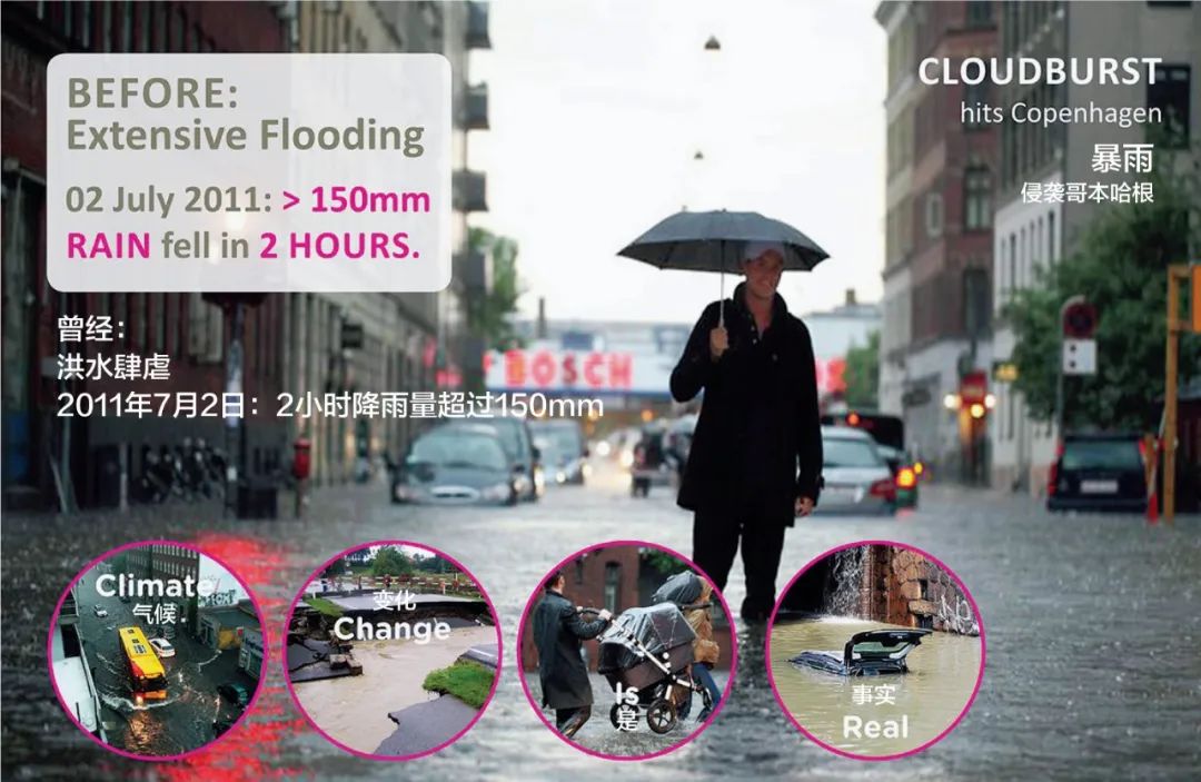 2010年8月與2011年8月,哥本哈根市在兩年內(nèi)接連遭受了三次毀滅性的暴雨襲擊。從統(tǒng)計數(shù)據(jù)看,三次暴雨均為百年一遇的極端降水事件,盡管理論上它們在12個月內(nèi)連續(xù)發(fā)生的概率極低。然而,統(tǒng)計數(shù)據(jù)是一回事,現(xiàn)實卻是另一回事。這些暴雨災(zāi)害也許正是氣候變化為現(xiàn)代城市敲響的警鐘。在這些暴雨事件中,哥本哈根不可計數(shù)的高速公路、主干道、列車軌道和其他基礎(chǔ)設(shè)施被淹沒在洪水中,同樣被淹的還有大量的商店與住宅。這三次特大暴雨所造成的經(jīng)濟損失累計達到80億元人民幣。