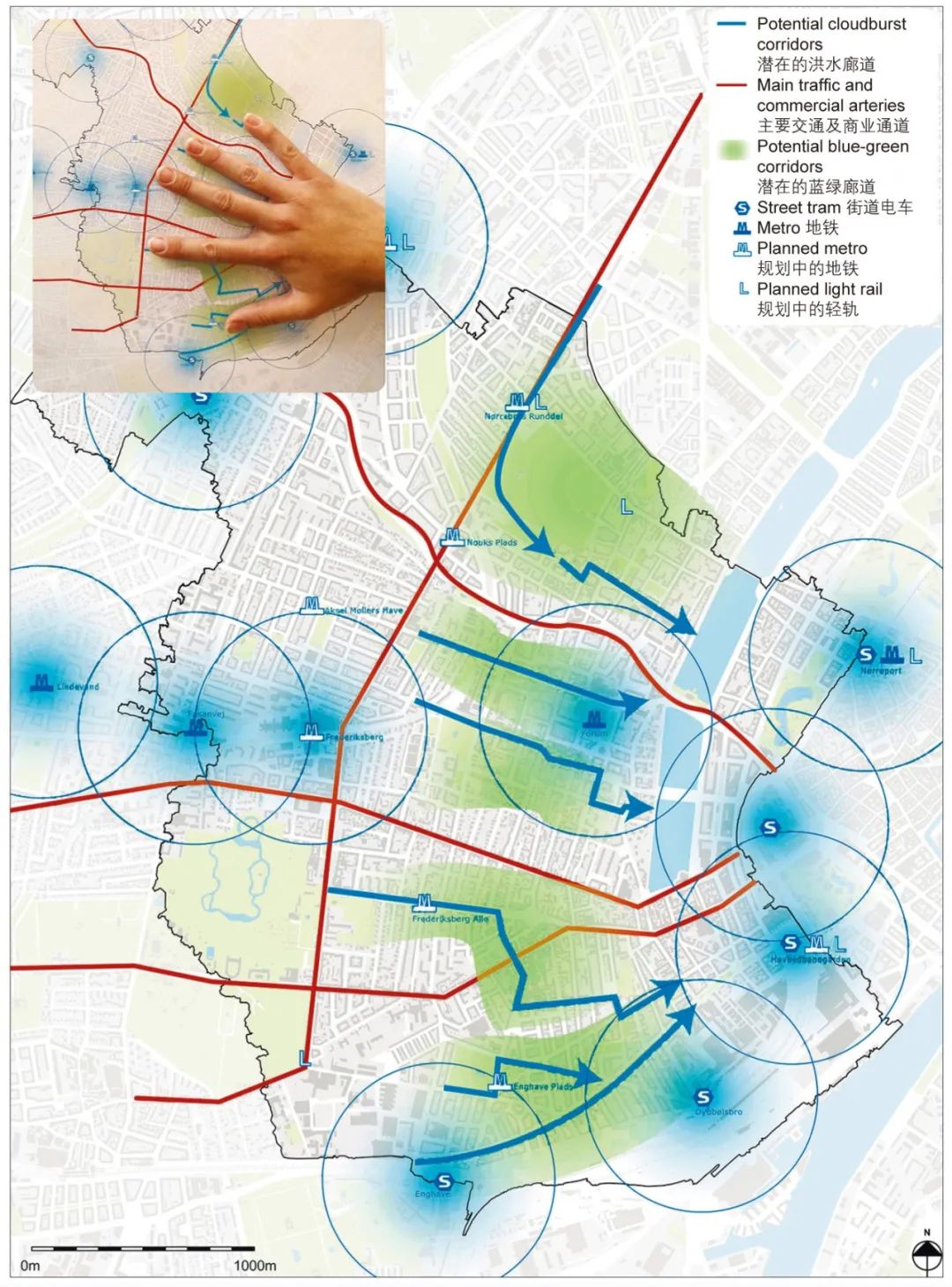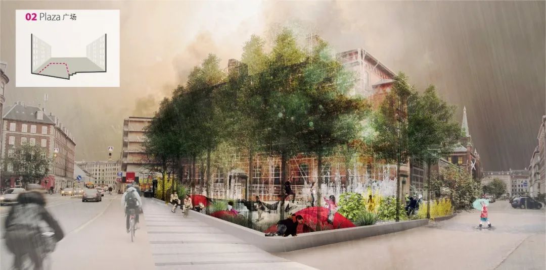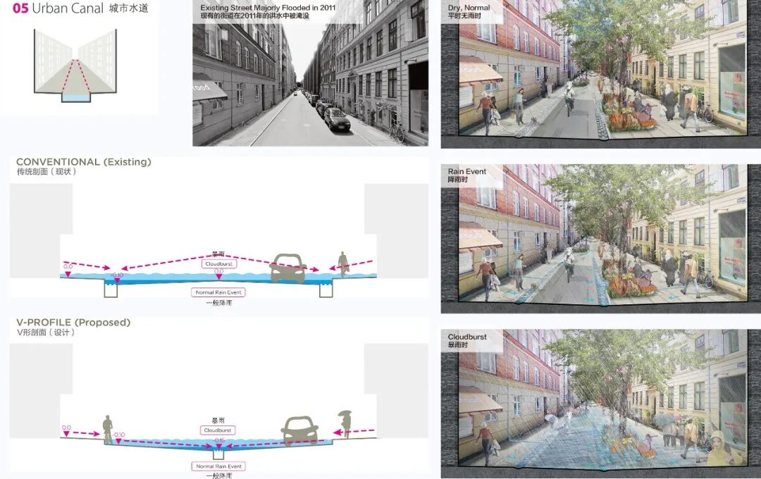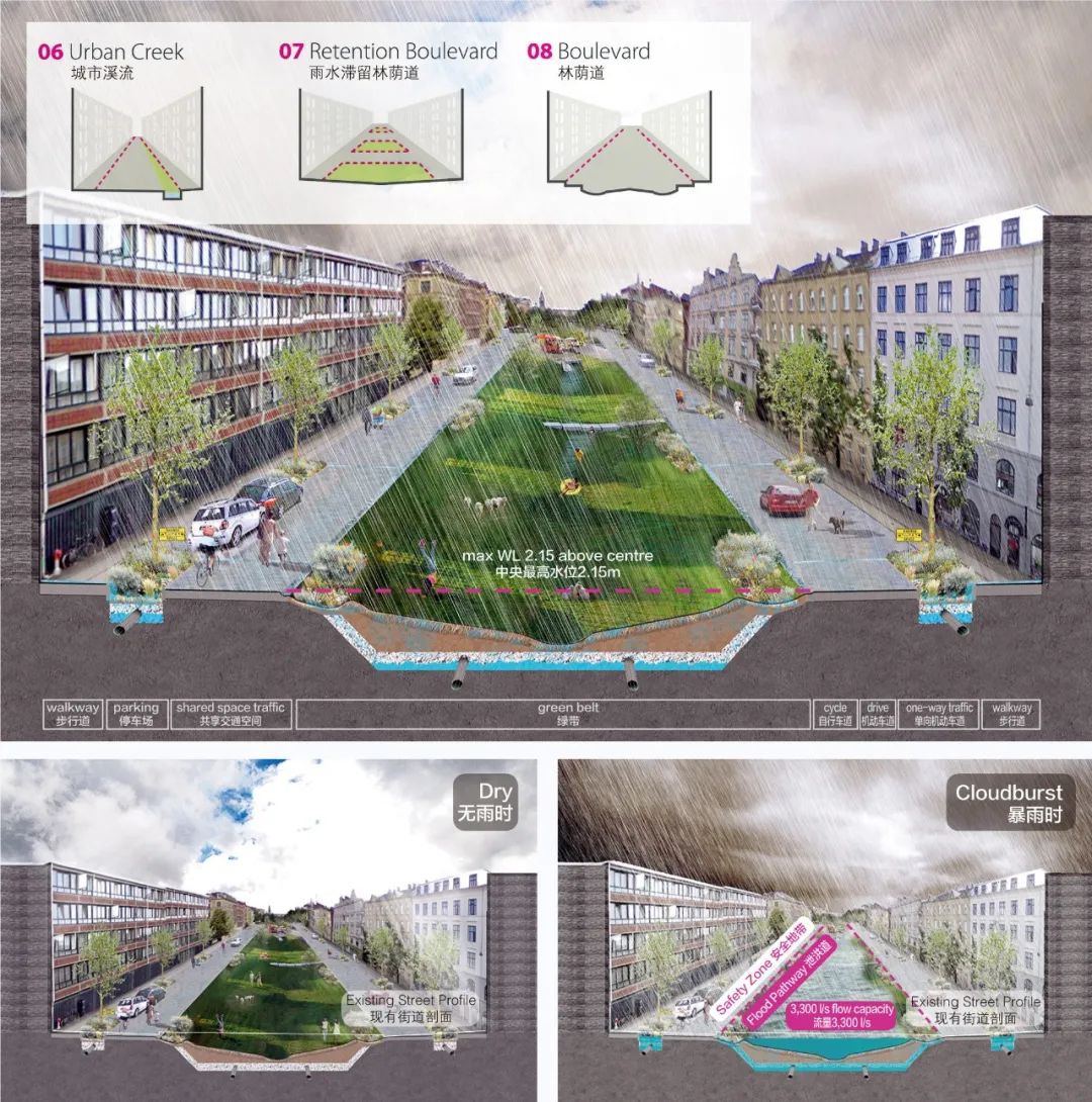 在海綿城市設(shè)計中,對城市宜居性的提升應(yīng)與對氣候的適應(yīng)并重。作為此方面的典范,丹麥?zhǔn)锥几绫竟械谋┯攴揽卦敿氁?guī)劃提出了一套雄心勃勃的計劃,旨在幫助城市免受未來的暴雨之害。總體規(guī)劃確立后,哥本哈根市政府開始著手為城市的各個分區(qū)制定具體的海綿城市景觀設(shè)計方案。此次景觀設(shè)計將不僅能夠應(yīng)對日益頻繁的極端暴雨天氣,還可以大幅度提升城市的宜居性,造福今時與后世的居民。此外,整套規(guī)劃的總體耗資也低于傳統(tǒng)工程方案。