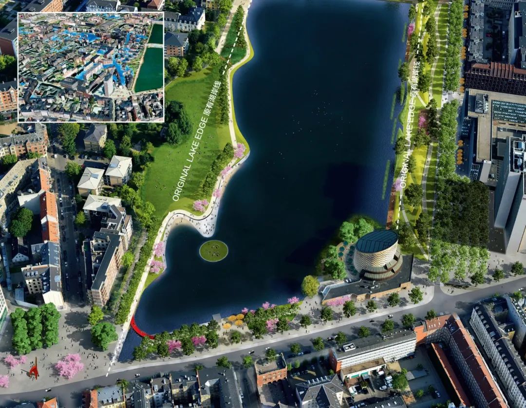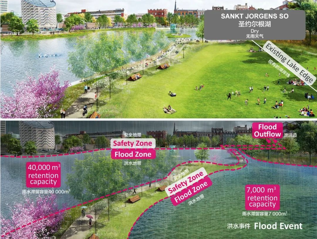 我們的具體策略之一是雨水滯留公園,這是我們的海綿城市“暴雨防控方案”中的一個關(guān)鍵要素。眾所周知,景色怡人的“藍綠公園”能夠為居民健康帶來巨大裨益,而經(jīng)過設(shè)計,這些公園也可以成為吸納特大洪水的“海綿”。該規(guī)劃充分利用哥本哈根市區(qū)三大內(nèi)湖之一的圣約爾根湖,通過將湖水水位由5.8m降低到2.8m,使其成為一座風(fēng)景秀美的湖濱公園。在提升城市休閑娛樂價值的同時,海綿城市設(shè)計也為城市創(chuàng)造出一大片雨水集蓄區(qū)。而傳統(tǒng)的工程設(shè)計方式則只能通過建造巨型的、造價高昂的泄洪道或管網(wǎng)來傳輸雨水——而鑒于大型暴雨事件十分罕見,這些設(shè)施在絕大多數(shù)情況下都將處于閑置狀態(tài)。與埋設(shè)地下雨洪排水管的工程造價相比,建造于地上的圣約爾根湖方案將節(jié)省大約10億元人民幣。通過這一看似簡單的景觀設(shè)計策略,安博實現(xiàn)了以遠低于傳統(tǒng)水泥蓄水池的成本來建造巨型蓄水設(shè)施的目標(biāo)。更為重要的是,人們可以走進我們新建的藍綠公園,享受閑暇與歡愉。