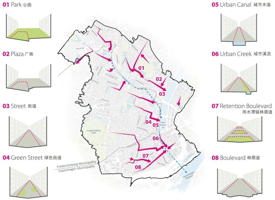 整合后的規(guī)劃將為城市帶來諸多額外效益。隨著對總體規(guī)劃愿景的細化,哥本哈根城區(qū)被分為8個區(qū)域,每個區(qū)域作為一個獨立的集水區(qū),均需要更為細致的具體規(guī)劃方案。安博負責(zé)其中4個區(qū)域的具體實施方案設(shè)計,其中包括暴雨街道、雨水滯留街道、綠色街道的具體設(shè)計,及如何通過這些方案實現(xiàn)提升城市宜居性的總體目標(biāo)。