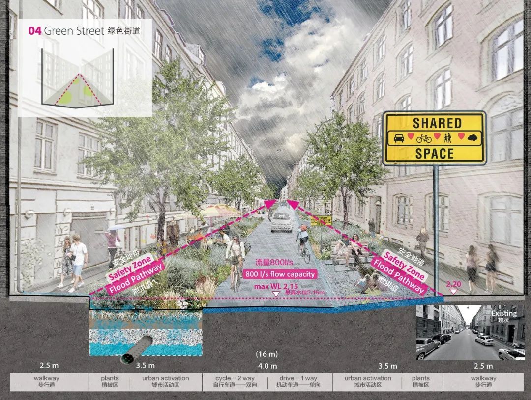 另一個用來緩解極端暴雨影響的具體策略是雨水滯留街道。這些街道通常是位于低洼、脆弱區(qū)域上游的次級道路,通過街道內(nèi)部的設(shè)計來創(chuàng)造巨大的蓄水空間。在不對交通產(chǎn)生重大妨礙的情況下,這些次級道路通??杀桓脑斐捎晁疁艚值?。通過增加洼地、透水鋪裝等方式實現(xiàn)對雨水的滯留,并可以凈化雨水,從而實現(xiàn)對地下含水層的補給。