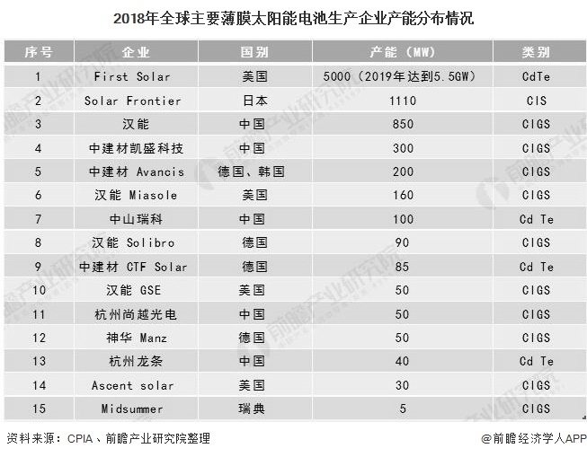 根據(jù)CPIA顯示,2018年First Solar公司的薄膜太陽能電池產(chǎn)能為5GW,到2019年已經(jīng)達到5.5GW;此外,Solar Frontier公司在2018年薄膜太陽能電池產(chǎn)能也達到了1.11GW,位于世界前列。