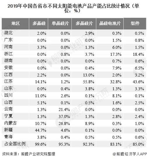 2019年我國光伏產品產能分布較為廣泛,上游多晶硅和硅片的產能主要集中在電價更低的西部地區(qū),尤其是新疆、四川、寧夏、云南等地。中下游電池片和組件主要集中在東部地區(qū),如浙江和江蘇,兩者產能占全國產能比重超過60%。