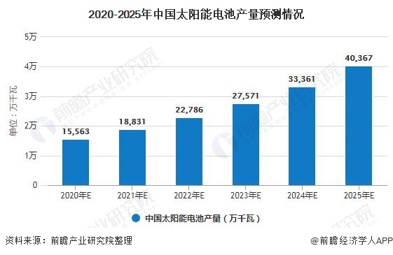 自531新政發(fā)布以來,光伏產業(yè)鏈各環(huán)節(jié)價格已降低了30%-40%,光伏平價上網加速推進中。同時受下游光伏企業(yè)對光伏電池降本增效的需求,以及高效太陽能電池片技術驅動的影響,電池迎來需求浪潮。前瞻預測到2025年,我國太陽能電池產量將達到40367萬千瓦。