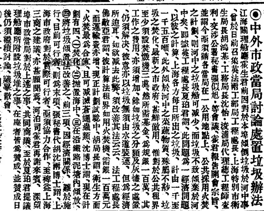 江海關(guān)理船應(yīng)霍生君前因?qū)侗静簝A倒垃圾於河中事丶曾於日前召集英法兩江部局工程處長(zhǎng)·上海特別市衛(wèi)生局長(zhǎng)胡鴻基·工務(wù)局長(zhǎng)沈怡·浚浦局代理總工程師查利·交涉公署秘書張似旭·等會(huì)議丶霍君報(bào)告開會(huì)宗旨丶並謂今亟須請(qǐng)各當(dāng)局在一公用地點(diǎn)上丶公共採(cǎi)用火焚之計(jì)劃丶則河中之垃圾船可減少丶而垃圾不致傾棄於河中矣丶即據(jù)英工程處長(zhǎng)夏珀君謂丶此問題爲(wèi)一經(jīng)濟(jì)問題丶以彼之計(jì)算丶上海各方每日所出之垃圾丶計(jì)由一千至一千五百噸丶此外傾於河中之菜蔬物質(zhì)丶殊屬不尠丶垃圾之焚化丶最新之市政府丶甚鮮倣用丶惟對(duì)於公共租界至少須設(shè)焚燬機(jī)三處丶然所需基金丶爲(wèi)規(guī)銀一百萬(wàn)丶其工作之費(fèi)用丶亦須增加丶餘如垃圾之分類及灰燼之處置丶仍須解決丶彼意亦以垃圾無(wú)須由水道裝運(yùn)丶但爲(wèi)經(jīng)濟(jì)所迫耳丶如欲減去此弊丶須改善其法云云……