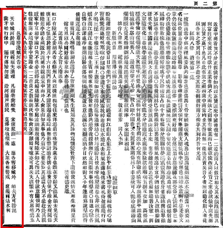 1872年12月27日《申報(bào)》一則題為“邑尊撈淺城河告示”的消息,其中提及“沿河鋪戶居民 莫將垃圾傾棄 大眾各相警戒 庶幾同沾水利”