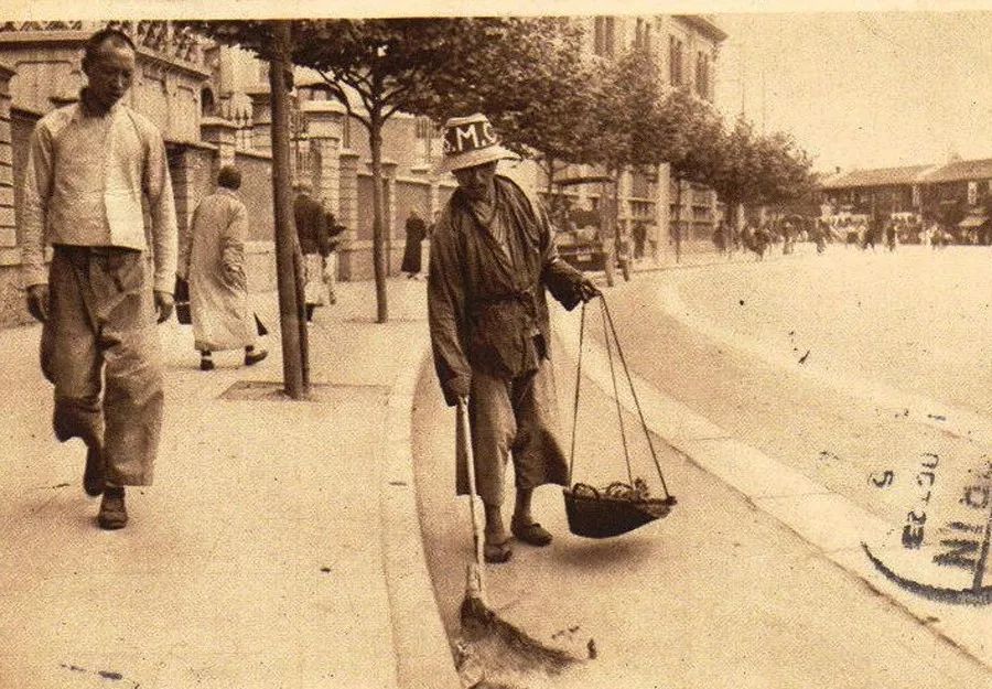 民國(guó)初年,上海街頭的清道夫。帽子上有S.M.C 字樣,意為上海工部局的英文縮寫