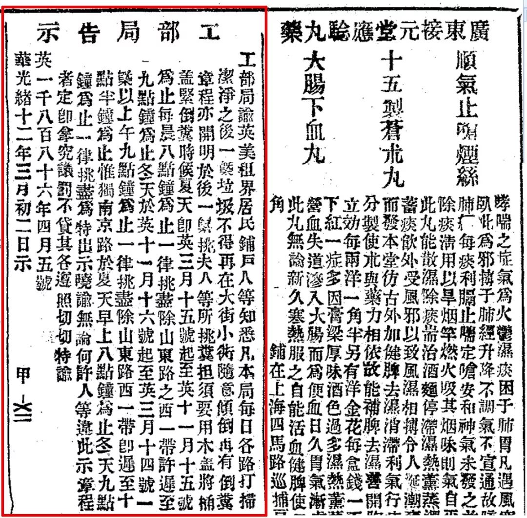 1886年4月30日《申報(bào)》刊登租界當(dāng)局關(guān)于定時(shí)收集垃圾和糞便的通告