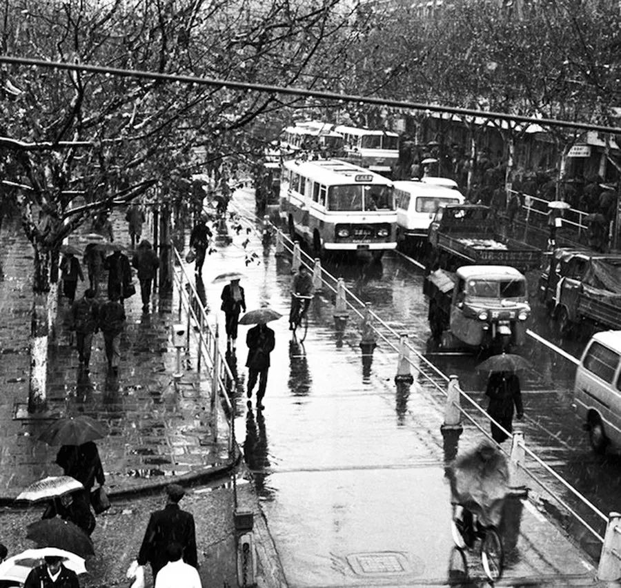 1981年的上海街景。圖中那輛三輪環(huán)衛(wèi)車輛,很可能是上海市工具修配廠1968年開始試制,20世紀(jì)70年代的主力環(huán)衛(wèi)垃圾清運(yùn)車——工農(nóng)牌手把式三輪機(jī)動(dòng)垃圾車(陸杰/攝)