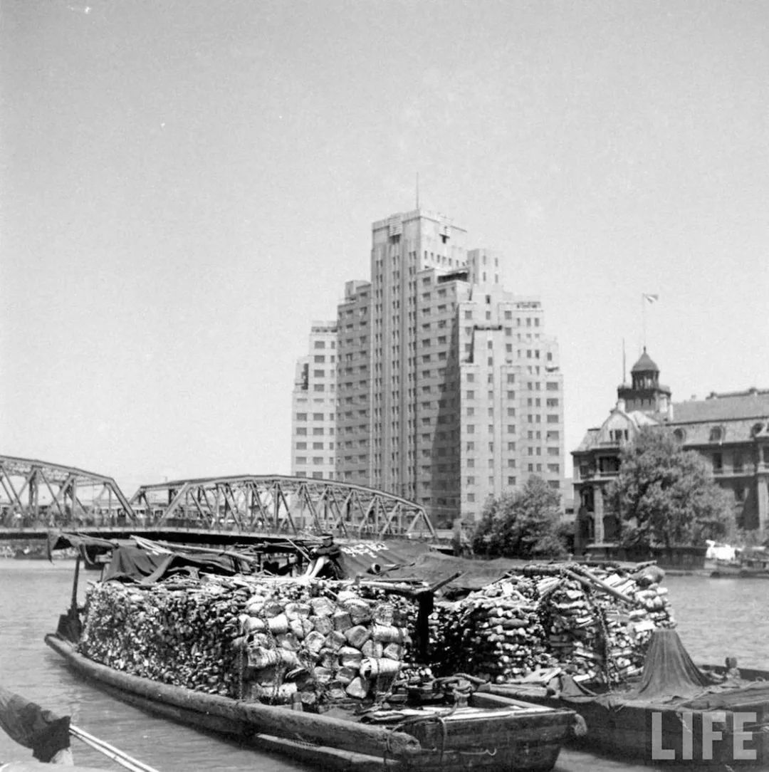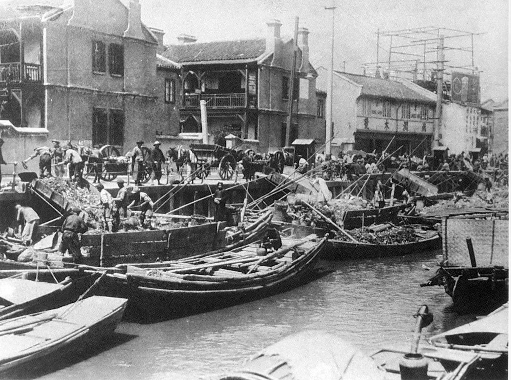 20世紀(jì)40年代后期,蘇州河口中運(yùn)輸垃圾的駁船。圖中可見,裝載的垃圾已經(jīng)過初步歸類