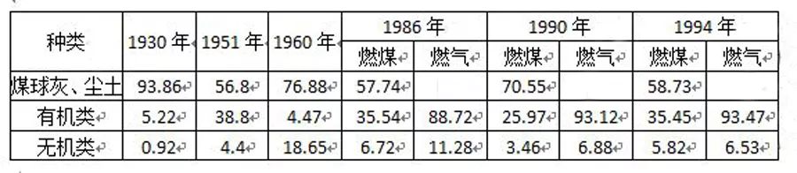 注:(1)1930年數(shù)據(jù)以公共租界統(tǒng)計(jì)資料為依據(jù);(2)1986年后居民生活垃圾成分為使用燃煤制品和煤氣兩類地區(qū)統(tǒng)計(jì)