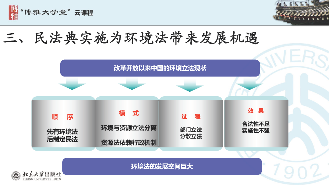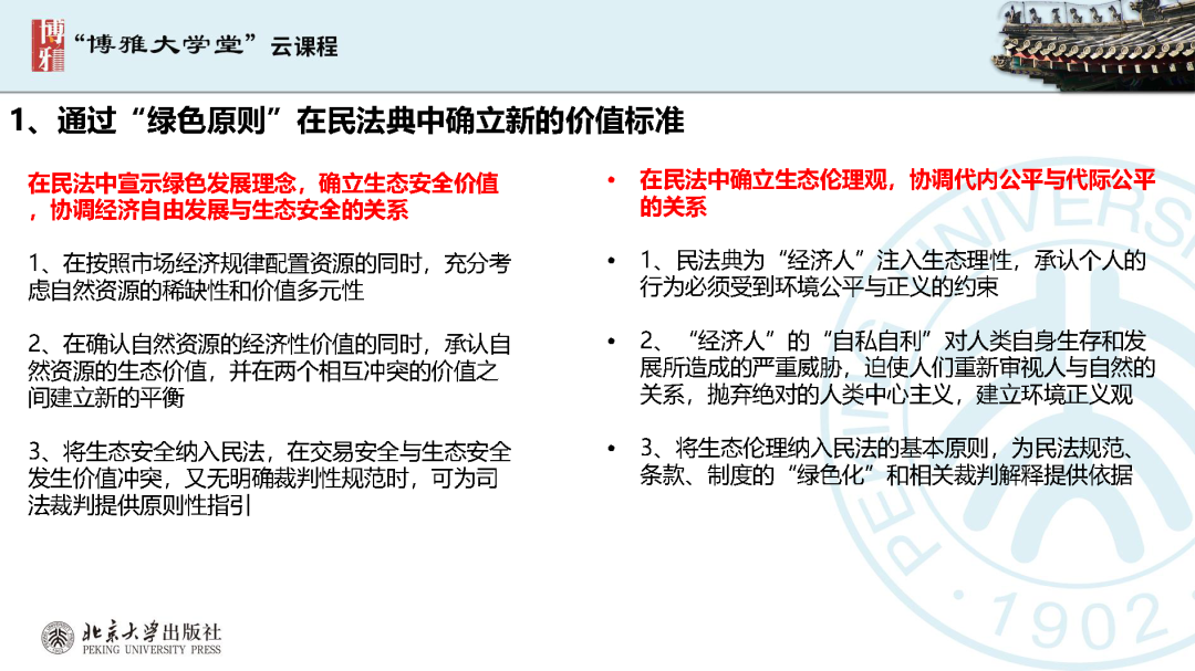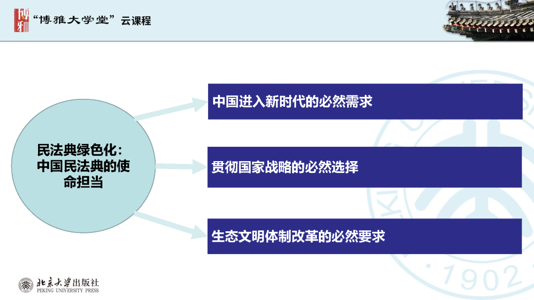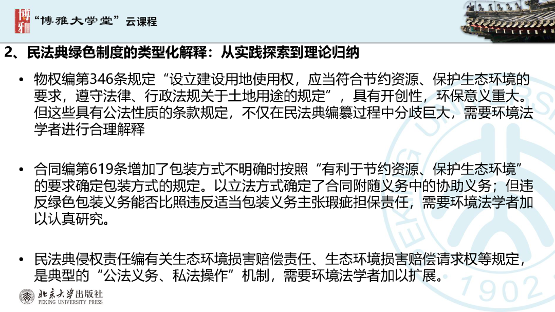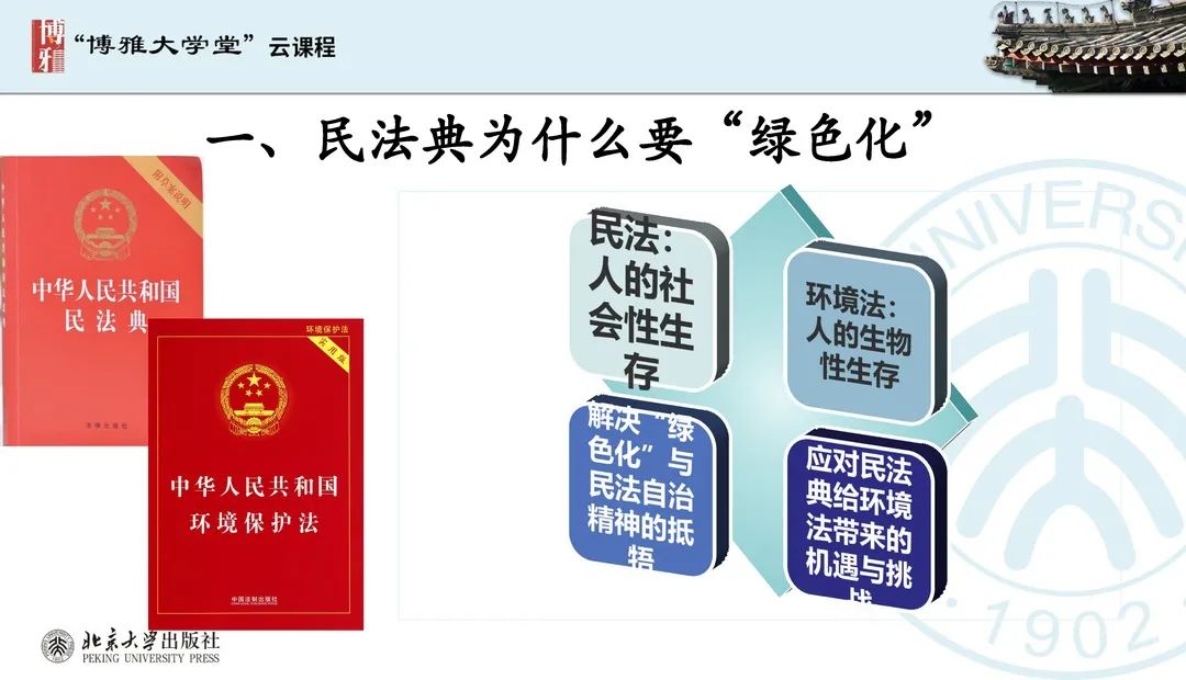 本文為?呂忠梅?老師在博雅大學(xué)堂上的報告。題目為《綠色民法典實施:環(huán)境法的機遇與挑戰(zhàn)》。內(nèi)容主要涉及民法典為什么要綠色化、民法典的綠色規(guī)則體系及綠色民法典給環(huán)境法帶來的新機遇和新挑戰(zhàn)。
