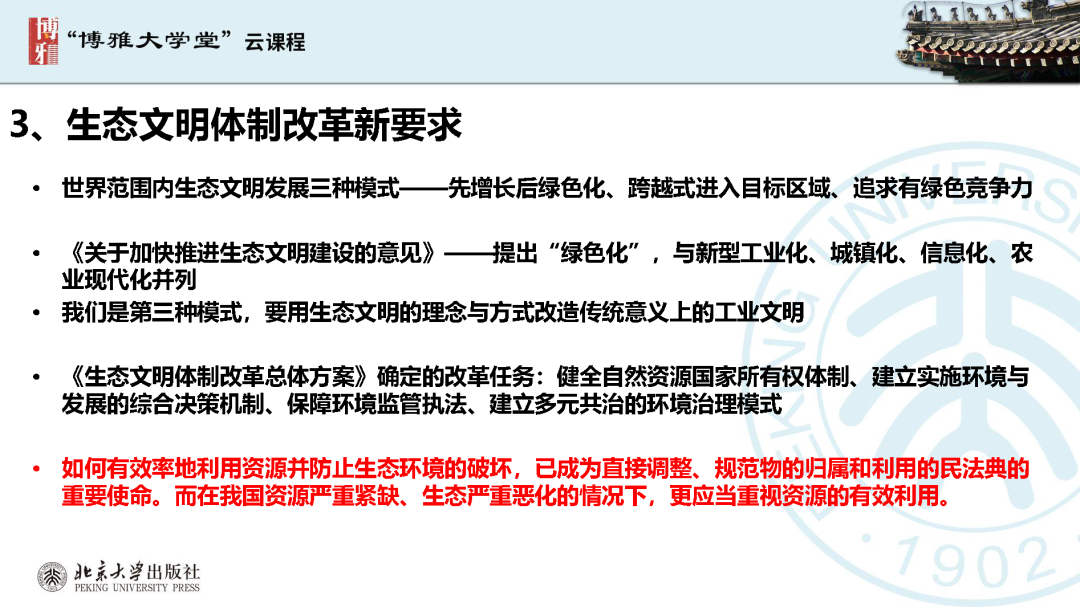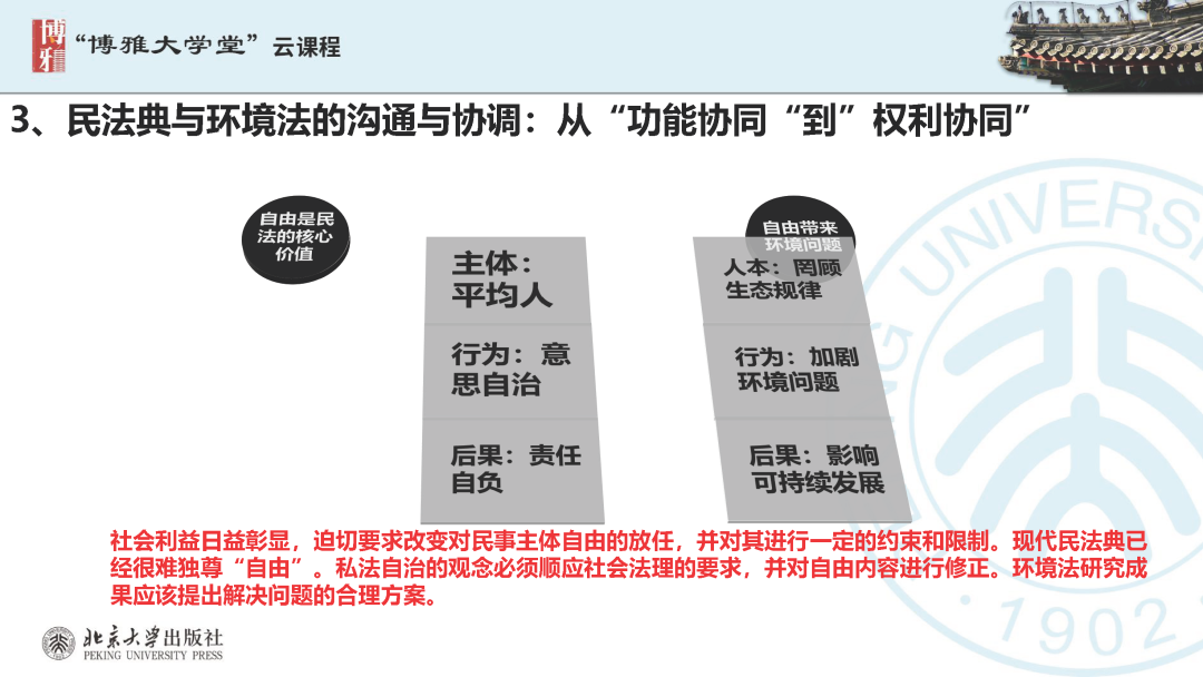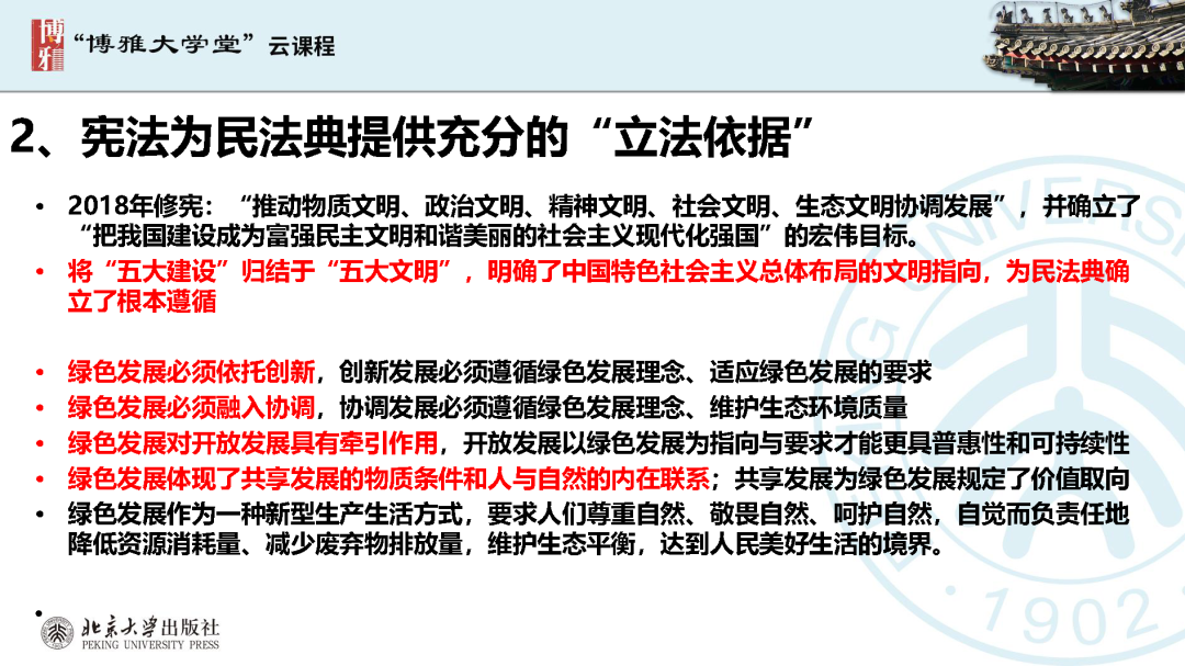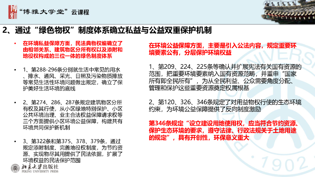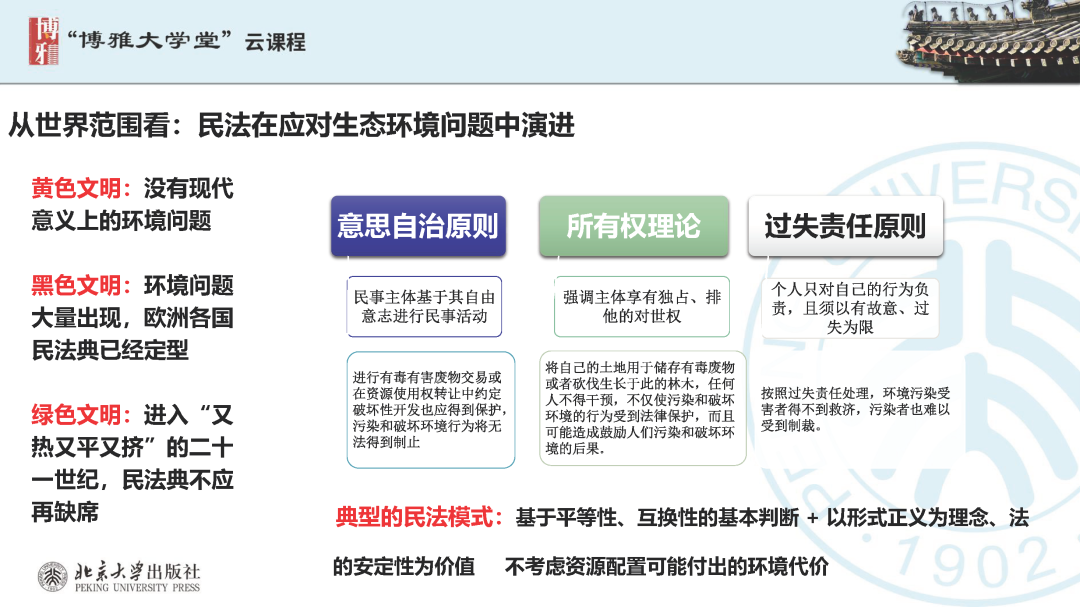 本文為?呂忠梅?老師在博雅大學(xué)堂上的報告。題目為《綠色民法典實施:環(huán)境法的機遇與挑戰(zhàn)》。內(nèi)容主要涉及民法典為什么要綠色化、民法典的綠色規(guī)則體系及綠色民法典給環(huán)境法帶來的新機遇和新挑戰(zhàn)。