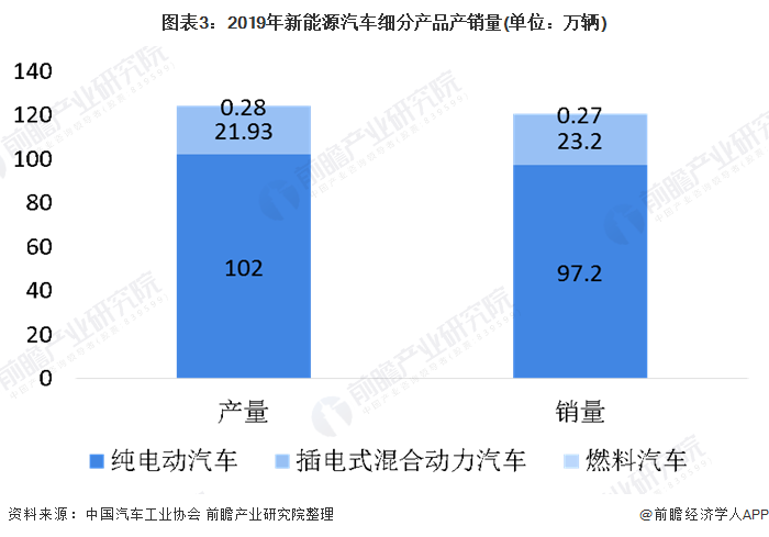 2019年至今,新能源汽車銷售細分市場格局未發(fā)生改變。2019年新能源汽車銷量中仍以純電動汽車銷售為主,為97.2萬輛,其次是插電式混合動力汽車為23.2萬輛。