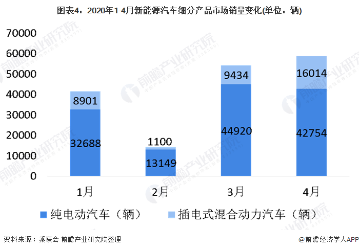 2020年初新冠肺炎疫情全面爆發(fā),亦對新能源汽車的銷售產(chǎn)生了不小的影響。2020年1-4月中國新能源汽車市場整體先跌后漲,其中2、3月震蕩較為明顯,4月則小幅增長,達到2020年1-4月銷量最高值,4月共銷售5.88萬輛。