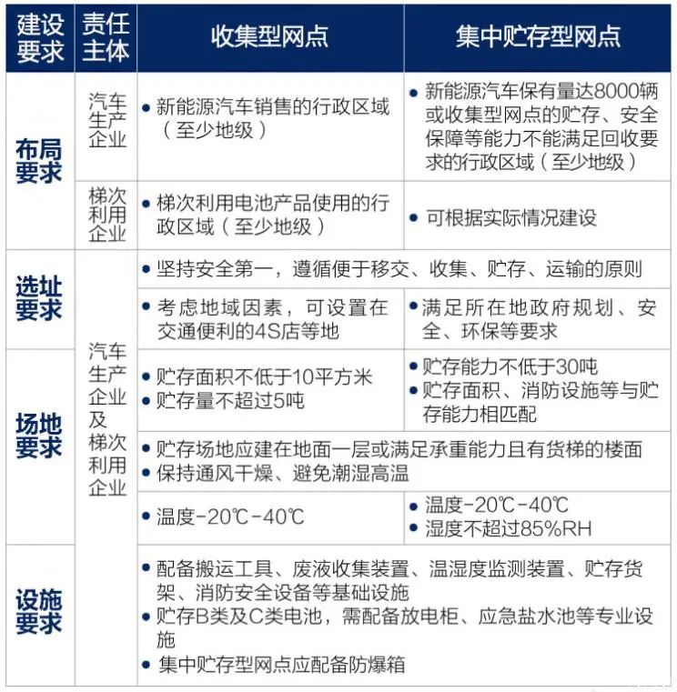 電池回收網(wǎng)點分為收集型網(wǎng)點和集中貯存型網(wǎng)點。這兩類網(wǎng)點分工也不難理解,收集型網(wǎng)點是收集、暫存廢舊動力電池的場地,主要用于存放從車主手中回收到的動力電池;集中貯存型網(wǎng)點,則是大批量儲存報廢車輛或者廢舊動力電池的場地,用于中轉、集中儲運回收上來的動力電池。