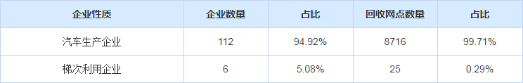 汽車之家統(tǒng)計出工信部公布的動力電池回收網(wǎng)點情況,截至2020年5月,全國共有回收服務網(wǎng)點8741個,其中涉及整車企業(yè)112家,梯次利用企業(yè)6家。從網(wǎng)點分布情況來看,車企建立的回收網(wǎng)點占據(jù)絕大部分數(shù)量,在全國各地均有覆蓋。從具體網(wǎng)點來看,以汽車企業(yè)4S店網(wǎng)絡為主,也有少部分與車企合作的報廢拆解企業(yè)建立的網(wǎng)點,以及梯次利用企業(yè)建立的網(wǎng)點。