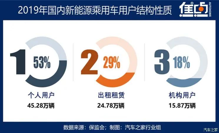 再看新能源乘用車都賣給了誰?以2019年數(shù)據(jù)為例,汽車之家了解到,個體用戶、出租租賃、機構用戶是新能源乘用車采購的三大“金主”。