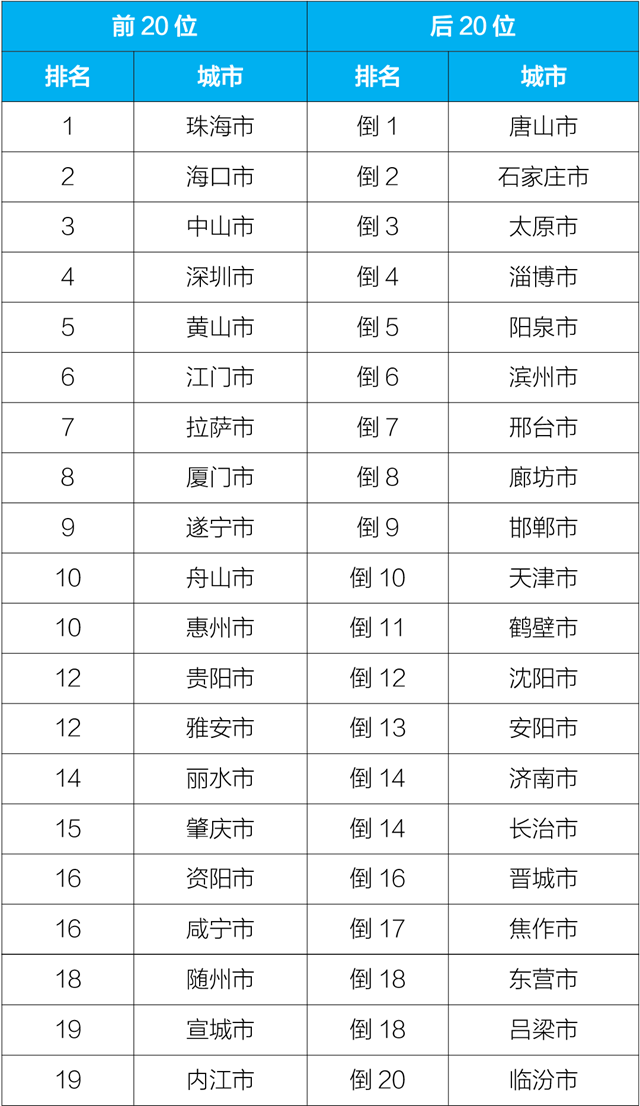 7月,168個(gè)重點(diǎn)城市中唐山、石家莊和太原市等城市空氣質(zhì)量相對(duì)較差(從倒數(shù)第1名至倒數(shù)第20名);珠海、海口和中山市等城市空氣質(zhì)量相對(duì)較好(從第1名至并列第19名,見(jiàn)附表5)。