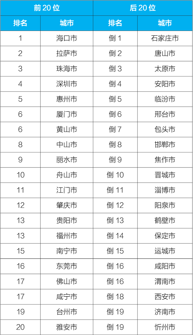 1-7月,168個(gè)重點(diǎn)城市中石家莊、唐山和太原市等城市空氣質(zhì)量相對(duì)較差(從倒數(shù)第1名至并列倒數(shù)第19名);???、拉薩、珠海市等城市空氣質(zhì)量相對(duì)較好(從第1名至第20名,見(jiàn)附表6)。