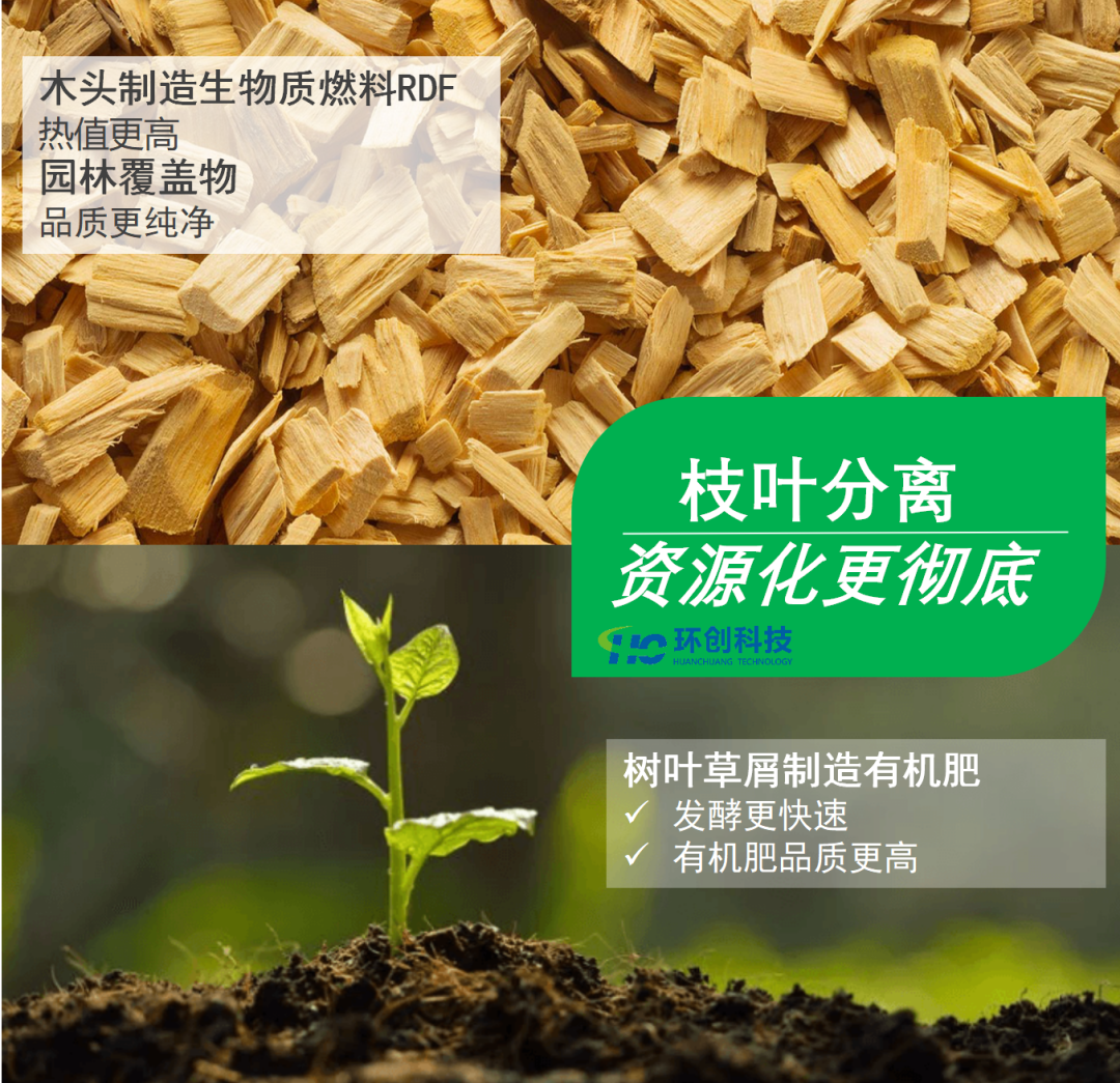 環(huán)創(chuàng)科技研發(fā)的枝葉分離系統(tǒng),有效解決了這一問題。該系統(tǒng)可根據(jù)木質(zhì)素含量高低,將枝干和樹葉草屑分開。枝干用于制造生物質(zhì)燃料RDF,樹葉草屑用于堆肥產(chǎn)出有機肥。