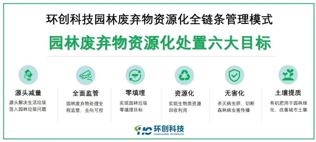 環(huán)創(chuàng)科技“園林廢棄物資源化全鏈條管理模式”,能夠有效解決目前普遍存在的園林廢棄物的監(jiān)管和處置問題,實現(xiàn)園林廢棄物管理“源頭減量、全面監(jiān)管、零填埋、資源化、無害化、土壤提質(zhì)”等六大目標。