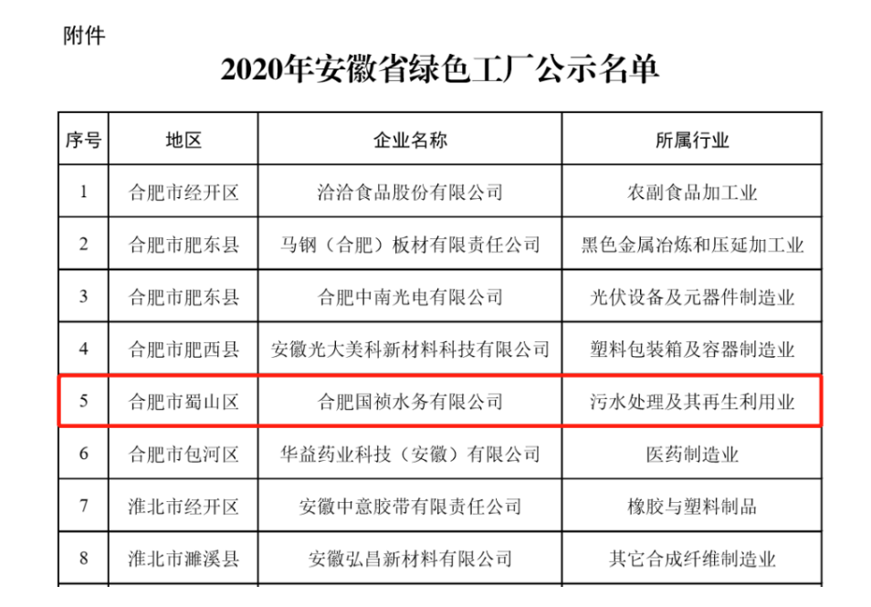 8月25日,安徽省經(jīng)濟和信息化廳“2020年安徽省綠色工廠擬評價名單”公示結(jié)束,國禎環(huán)保合肥市清溪凈水廠榮獲省級“綠色工廠”榮譽稱號。