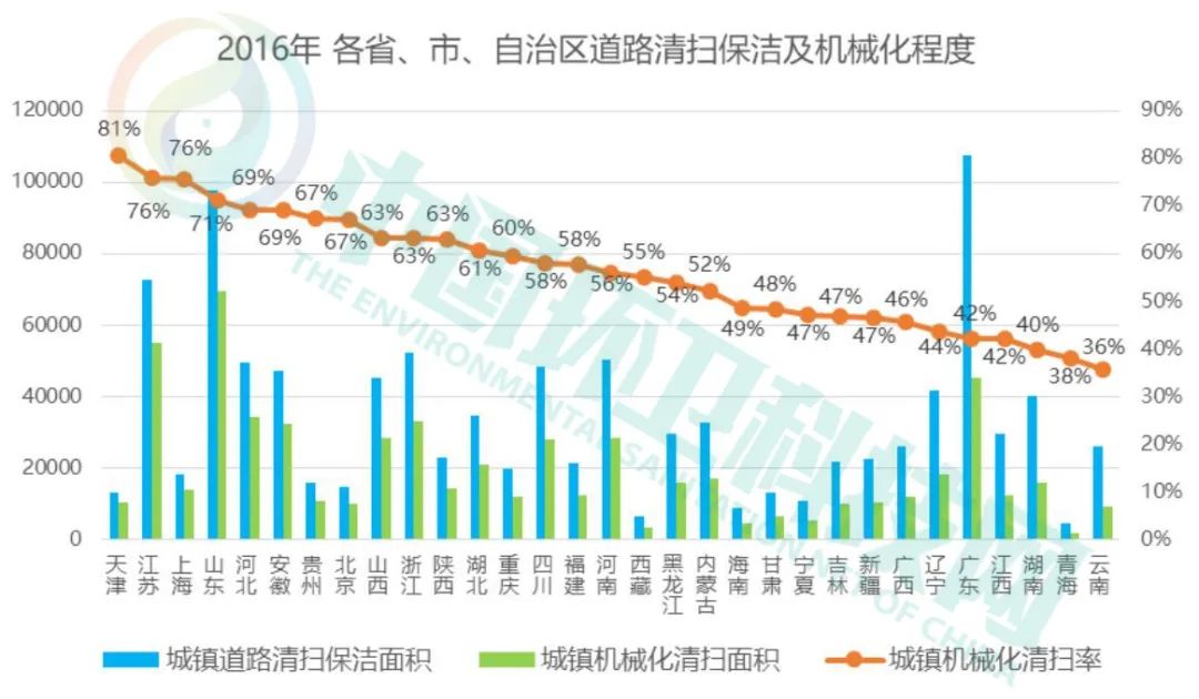 從環(huán)衛(wèi)機(jī)械化使用率來看,排名前三的天津、山東、江蘇均為東部省份,低于50%的省份中有一半屬于西部地區(qū),可見經(jīng)濟(jì)發(fā)展對機(jī)械化水平的提升有一定的制約作用。還有垃圾清運(yùn)量、道路清掃保潔等方面的數(shù)據(jù),也都印證了發(fā)展趨勢呈階梯、坡狀。