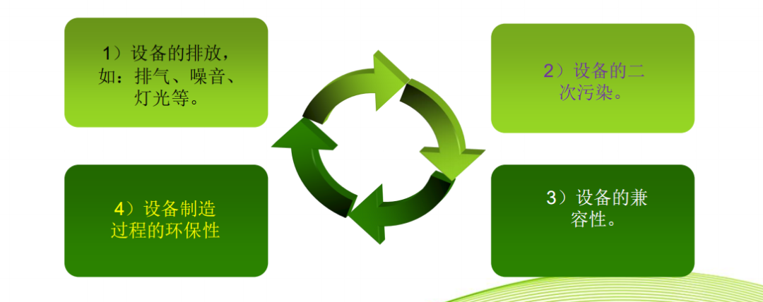(3)綠色。指對社會環(huán)境輸出時的損害程度,兼顧著“環(huán)境和諧”的社會屬性,關(guān)乎到設(shè)備樣貌吸引力、排放(排氣、噪音、燈光等)、二次污染、兼容性等。關(guān)于綠色環(huán)保,也將其概念做了延伸,行業(yè)內(nèi)與中環(huán)協(xié)都在不斷的向其中添加新內(nèi)容,這將是未來發(fā)展趨勢之一。