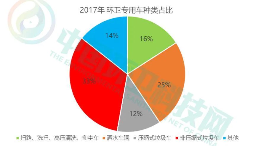 產(chǎn)品分類方面,以2017年數(shù)據(jù)作為基礎(chǔ),垃圾車在環(huán)衛(wèi)專用車種類的占比可達(dá)到45%,清洗清掃車輛占比16%、灑水車輛占比25%、其他垃圾轉(zhuǎn)運(yùn)和收集作用車輛占比14%的市場份額。