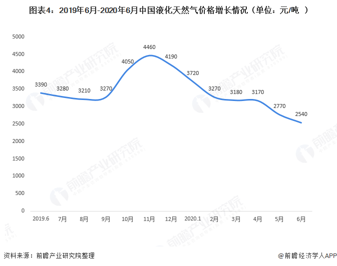 價(jià)格方面,2020年以來,中國(guó)液化天然氣價(jià)格總體趨于下降,2020年6月下降為2540元/噸。主要原因是一方面受新冠肺炎疫情影響,液化天然氣工廠原料氣充足但國(guó)內(nèi)天然氣市場(chǎng)整體需求不足,導(dǎo)致價(jià)格連續(xù)下降。另一方面,受國(guó)際低油價(jià)影響,與油價(jià)掛鉤的進(jìn)口液化天然氣價(jià)格持續(xù)走低,接收站加大進(jìn)口量,供應(yīng)充裕。