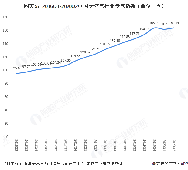雖然2020年以來液化天然氣價(jià)格持續(xù)走低,但是由于天然氣屬于穩(wěn)定的清潔資源,未來的發(fā)展空間依舊較大。發(fā)展“建筑節(jié)能”和可再生資源,是國(guó)家能源發(fā)展的必經(jīng)之路。據(jù)中國(guó)天然氣行業(yè)景氣指數(shù)研究中心,2016Q1-2020Q2中國(guó)天然氣行業(yè)景氣指數(shù)不斷提高, 2020年第二季度達(dá)到164.14點(diǎn)。
