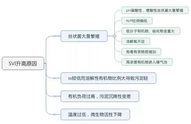 SVI值與污泥負(fù)荷有關(guān),污泥負(fù)荷過(guò)高或過(guò)低,活性污泥的代謝性能都會(huì)變差,SVI值也會(huì)變很高,存在出現(xiàn)污泥膨脹的可能。