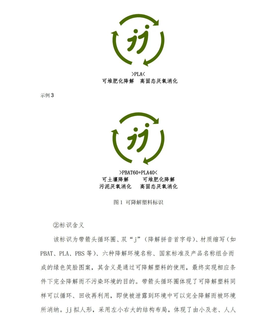 該標(biāo)識(shí)為帶箭頭循環(huán)圈、雙“j”(降解拼音首字母)、材質(zhì)縮寫(如PBAT、PLA、PBS等)、六種降解環(huán)境名稱、國家標(biāo)準(zhǔn)及產(chǎn)品名稱組合而成的綠色笑臉圖案,其含義是通過可降解塑料的使用,最終實(shí)現(xiàn)相應(yīng)條件下完全降解而不污染環(huán)境的目的。帶箭頭循環(huán)圈體現(xiàn)了可降解塑料同樣可以循環(huán)、回收再利用,即使被泄露到環(huán)境中可以完全降解而被環(huán)境所消納。jj擬人形,采用左小右大的結(jié)構(gòu)布局,體現(xiàn)了由小及老、人人愛護(hù)環(huán)境的設(shè)計(jì)理念。標(biāo)識(shí)的適宜規(guī)格應(yīng)根據(jù)產(chǎn)品的尺寸來確定,如果需要縮小或擴(kuò)大標(biāo)識(shí),應(yīng)遵守標(biāo)識(shí)給出的比例同等縮小或擴(kuò)大。可降解塑料標(biāo)識(shí)的樣式規(guī)范見附錄A。