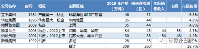 2019年國(guó)內(nèi)再生鋁產(chǎn)量達(dá)725萬(wàn)噸,前六大企業(yè)產(chǎn)能占比約29%,六大企業(yè)銷(xiāo)售額約260億。