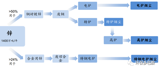 相比其他三大基本有色金屬(銅、鋁、鉛),鋅更加難以回收,再生率很低。鋅具有極高的防腐蝕性,因此其最大用途是鍍鋅工業(yè),鋼材鍍鋅、合金用鋅分別占鋅消費(fèi)的50%和24%以上,均需通過(guò)鋼鐵煙塵(高爐瓦斯灰)回收。這方面以鑫聯(lián)環(huán)保為代表。