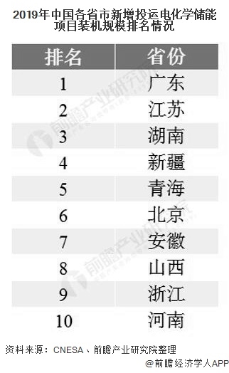 2019年,我國(guó)新增投運(yùn)的電化學(xué)儲(chǔ)能項(xiàng)目主要分布在28個(gè)省市區(qū)中(含港、澳、臺(tái)地區(qū)),裝機(jī)規(guī)模排名前十位的省市區(qū)分別是:廣東、江蘇、湖南、新疆、青海、北京、安徽、山西、浙江和河南,這十個(gè)省市區(qū)的新增規(guī)模合計(jì)占2019年我國(guó)新增總規(guī)模的88.9%。