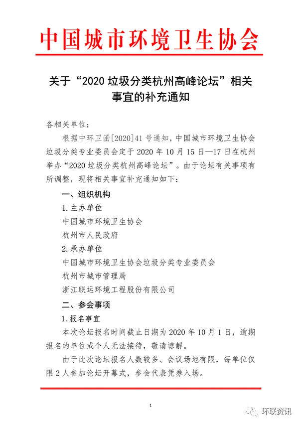 由中國城市環(huán)境衛(wèi)生協(xié)會(huì)和杭州市人民政府主辦,中國城市環(huán)境衛(wèi)生協(xié)會(huì)垃圾分類專業(yè)委員會(huì)、杭州市城市管理局及浙江聯(lián)運(yùn)環(huán)境工程股份有限公司承辦的“2020垃圾分類杭州高峰論壇”將于2020年 10 月 15 日—17 日在杭州舉行。