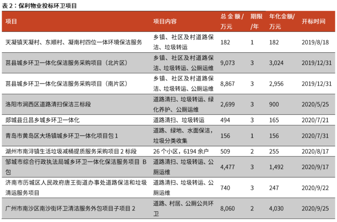 保利物業(yè)則大力發(fā)展環(huán)衛(wèi)項(xiàng)目投標(biāo)業(yè)務(wù)。截止2020年10月底,不完全統(tǒng)計(jì)投標(biāo)項(xiàng)目數(shù)量已達(dá)到16個(gè)。