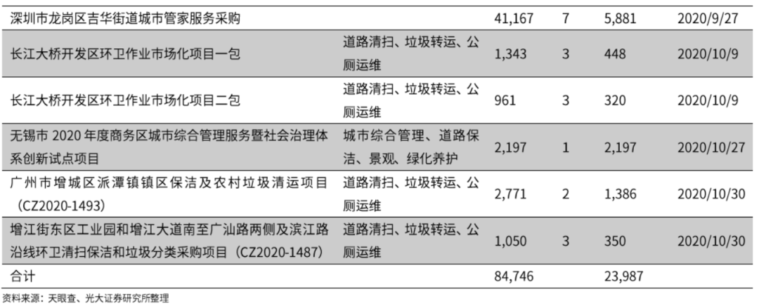 2019-2020年,隨著城市服務(wù)項(xiàng)目不斷增加,物業(yè)企業(yè)下沉至環(huán)衛(wèi)業(yè)務(wù),開始直接參與市場(chǎng)招投標(biāo),或在城市公服的基礎(chǔ)上疊加市政環(huán)衛(wèi)等人力密集型業(yè)務(wù)。綜上,我們認(rèn)為,城市服務(wù)商需要具備環(huán)衛(wèi)為主的市政綜合業(yè)務(wù)能力。