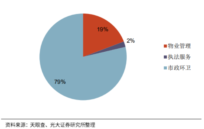 市政環(huán)衛(wèi)與公共物業(yè)占據(jù)絕大多數(shù)份額。原因在于,市政環(huán)衛(wèi)與公共物業(yè)都屬于人力密集型,而執(zhí)法/協(xié)管服務(wù)則不然。