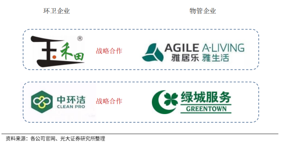 除了收并購和參與投標(biāo)外,物業(yè)與環(huán)衛(wèi)公司的戰(zhàn)略合作成為進(jìn)軍城市的第三條路徑。如玉禾田與雅生活,中環(huán)潔與綠城服務(wù)的戰(zhàn)略合作。