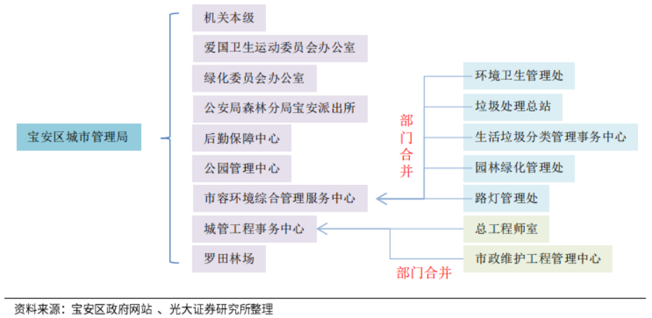 深圳市寶安區(qū)城市管理和綜合執(zhí)法局2018年,根據(jù)《關(guān)于整合成立深圳市寶安區(qū)市容環(huán)境綜合管理服務(wù)中心的通知》),深圳市寶安區(qū)城市管理和綜合執(zhí)法局下屬單位環(huán)境衛(wèi)生管理處、垃圾處理總站、生活垃圾分類管理事務(wù)中心、園林綠化管理處、路燈管理處整合成立市容環(huán)境綜合管理服務(wù)中心;根據(jù)《關(guān)于整合成立深圳市寶安區(qū)城管工程事務(wù)中心的通知》,局下屬單位總工程師室、市政維護(hù)工程管理中心整合成立城管工程事務(wù)中心。