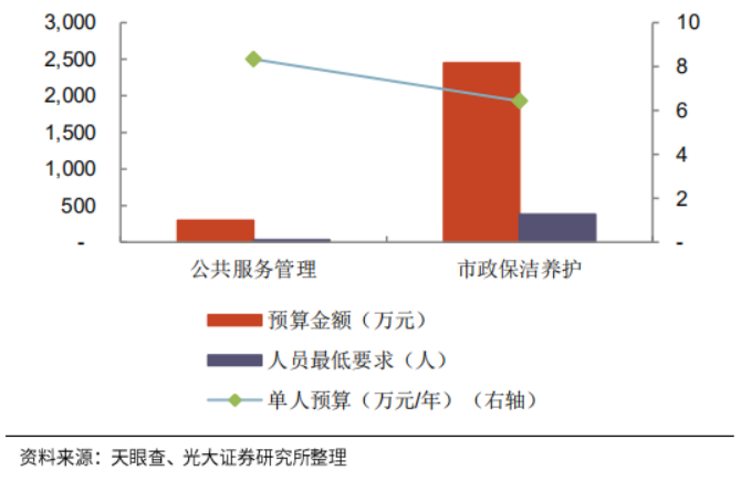 在珠海橫琴新區(qū)物業(yè)城市項(xiàng)目中,2020年前10個(gè)月,珠海大橫琴城市公共資源經(jīng)營有限公司當(dāng)年共承接項(xiàng)目金額3.9億元,其中市政環(huán)衛(wèi)、公共物業(yè)管理分別占比79%和19%。以天凝鎮(zhèn)全域化公共服務(wù)管理項(xiàng)目為例,主要分為市政環(huán)衛(wèi)和公服管理兩部分,而公共服務(wù)管理部分的預(yù)算金額和人員最低要求數(shù)量均為市政環(huán)衛(wèi)部分的10%左右。