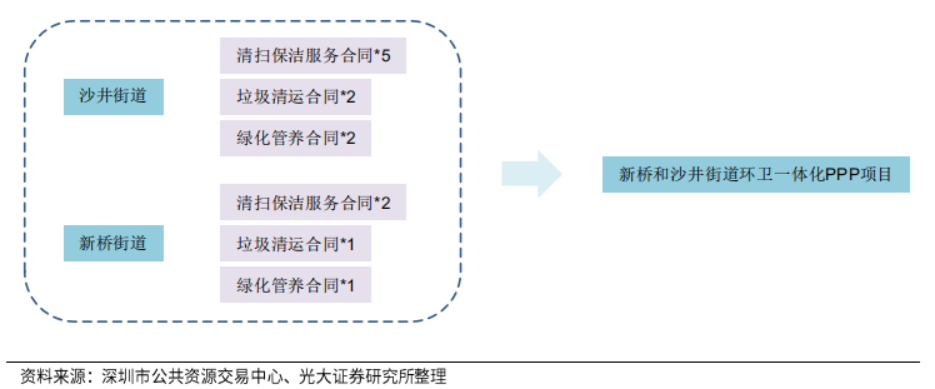 2020年,寶安區(qū)連續(xù)啟動(dòng)三個(gè)環(huán)衛(wèi)一體化項(xiàng)目,即新橋和沙井街道環(huán)衛(wèi)一體化PPP項(xiàng)目、新安、福永和福海街道環(huán)衛(wèi)一體化PPP項(xiàng)目、松崗、燕羅和石巖街道環(huán)衛(wèi)一體化PPP項(xiàng)目。預(yù)計(jì)在2022年全區(qū)實(shí)現(xiàn)環(huán)衛(wèi)一體化全覆蓋。以新橋和沙井街道環(huán)衛(wèi)一體化PPP項(xiàng)目為例,通過對(duì)碎片化招標(biāo)的替代,實(shí)現(xiàn)13個(gè)服務(wù)合同的合并。