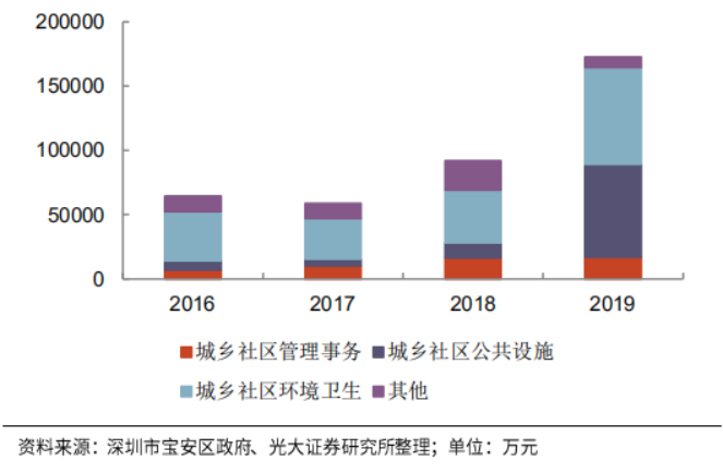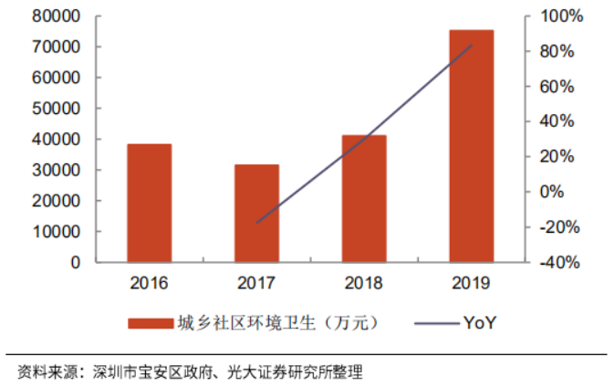 2018年,深圳市寶安區(qū)城市管理局完成部內(nèi)合并,并于2019年更名深圳市寶安區(qū)城市管理和綜合執(zhí)法局。2019年,其年度決算開支同比增速達(dá)到88%,其中城鄉(xiāng)社區(qū)公共設(shè)施和城鄉(xiāng)社區(qū)環(huán)境衛(wèi)生支出分別同比增加525%和83%。