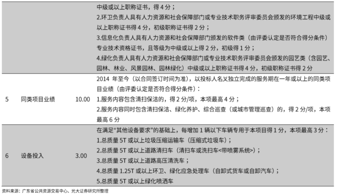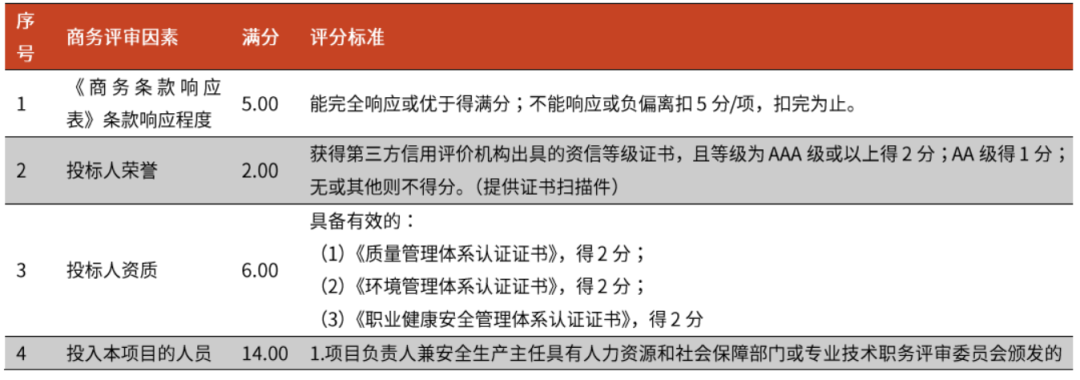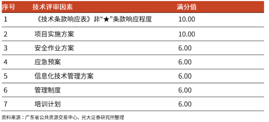技術(shù)部分評(píng)審因素則主要側(cè)重于項(xiàng)目實(shí)施方案、應(yīng)急預(yù)案、管理制度、培訓(xùn)計(jì)劃等,整體評(píng)價(jià)過程較為主觀,同時(shí)也對(duì)投標(biāo)企業(yè)的經(jīng)驗(yàn)有一定要求。