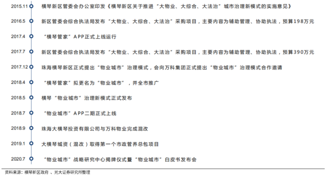 同時(shí),將27大類行政處罰權(quán)和7類審批管理權(quán)限由橫琴新區(qū)綜合執(zhí)法局集中行使。在綜合執(zhí)法局的推動(dòng)下,橫琴新區(qū)開始推進(jìn)“大物業(yè)、大綜合、大法治”城市治理新模式,并于2017年上線“橫琴管家”APP。在綜合執(zhí)法局連續(xù)兩年“大物業(yè)、大綜合、大法治”城市治理新模式項(xiàng)目采購的基礎(chǔ)上,橫琴新區(qū)向萬科集團(tuán)發(fā)出合作邀請(qǐng)。2018年9月,珠海大橫琴投資有限公司與萬科物業(yè)完成混改;2019年1月,大橫琴城資(混改)取得第一個(gè)市政管養(yǎng)總包項(xiàng)目,“橫琴模式”順利開展。