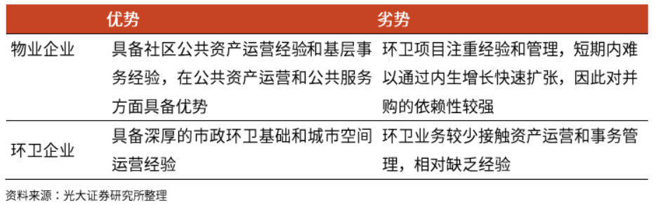 在“城市治理需求外延”主線中,物業(yè)企業(yè)從率先進(jìn)入公建物業(yè)和公共服務(wù)領(lǐng)域,并逐步培育環(huán)衛(wèi)業(yè)務(wù)能力;而環(huán)衛(wèi)企業(yè)則具備較深厚的市政環(huán)衛(wèi)基礎(chǔ),并向一體化方向拓展,同時(shí)嘗試公建物業(yè)和公共服務(wù)。
