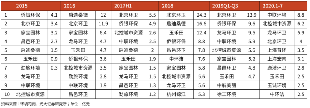 綜上,垃圾分類普及的背景下,環(huán)衛(wèi)業(yè)務(wù)成為“中間地帶”的趨勢(shì)在增強(qiáng)。而基于業(yè)務(wù)自身屬性,內(nèi)生增長依賴長期同類項(xiàng)目經(jīng)驗(yàn)累積,收并購有望成為打破現(xiàn)有競(jìng)爭(zhēng)格局的重要途徑。